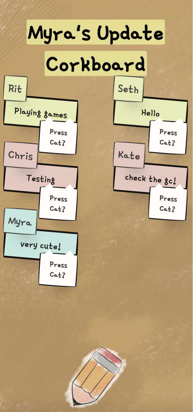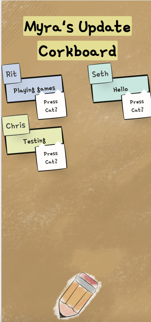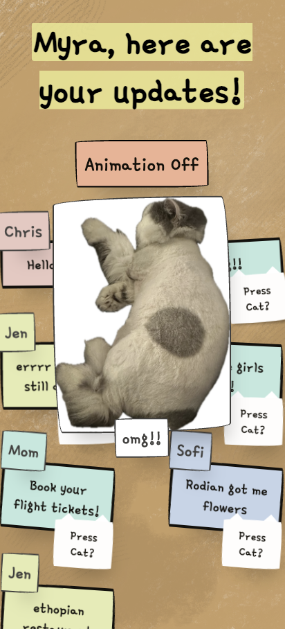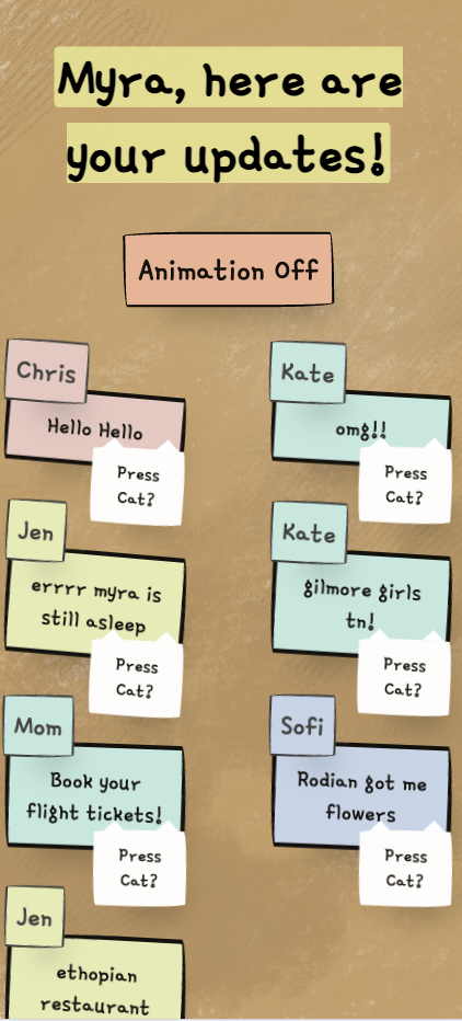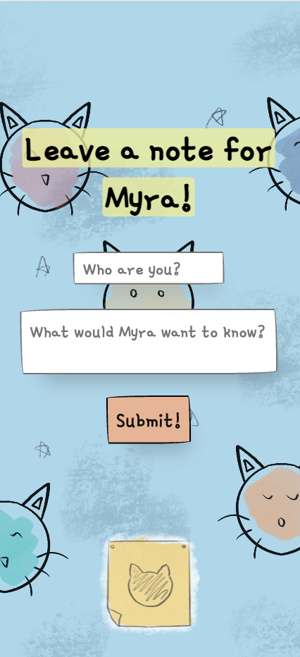 Tool Description: a website that allows friends to leave notes to Myra and allows her to replay those notes as meows from her favorite cat memes based on the length of the notes.