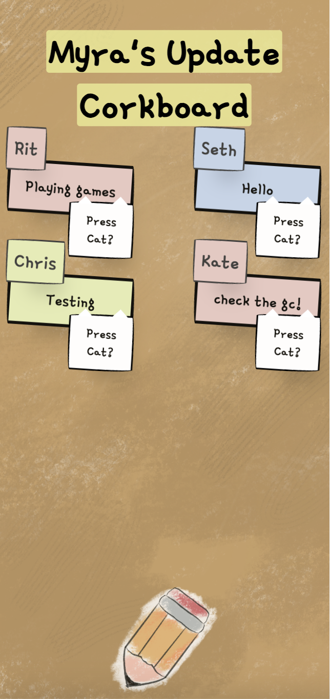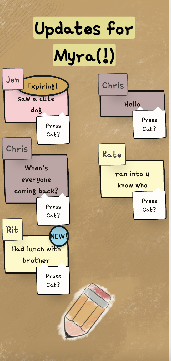 Why I’m making it: Myra wants to keep in touch with her friends who she sometimes does not see as much, as it’s difficult to keep up with all that goes on at Yale. Functions similar to Snapchat/Instagram Stories, but also sort of like a group chat - exclusive to who Myra gives her password out to.